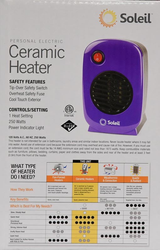Soleil Personal Electric Ceramic Heater 250 Watt Mh